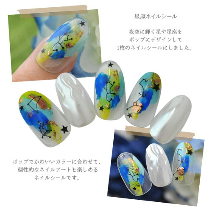 ウォーターネイルシール 雪 星座 ウィンター 選べる2種類 極薄・重ね貼りOK 重ね貼りも余裕でできる、極薄ネイルシールの単品です。 簡易パッケージの為、お安くなっております。 サイズ:H130×W55 使用方法 こちらの商品は使用するシールを星座 ネイルシール 星座 ネイルシール 夏の夜空を指先に閉じ込めて! 大人かわいい星座ネイルに注目 キラキラ光る星空を ネイル にアレンジ。 大好きな星モチーフを使ったり、 ネイル シールを使ったりとアレンジも豊富。